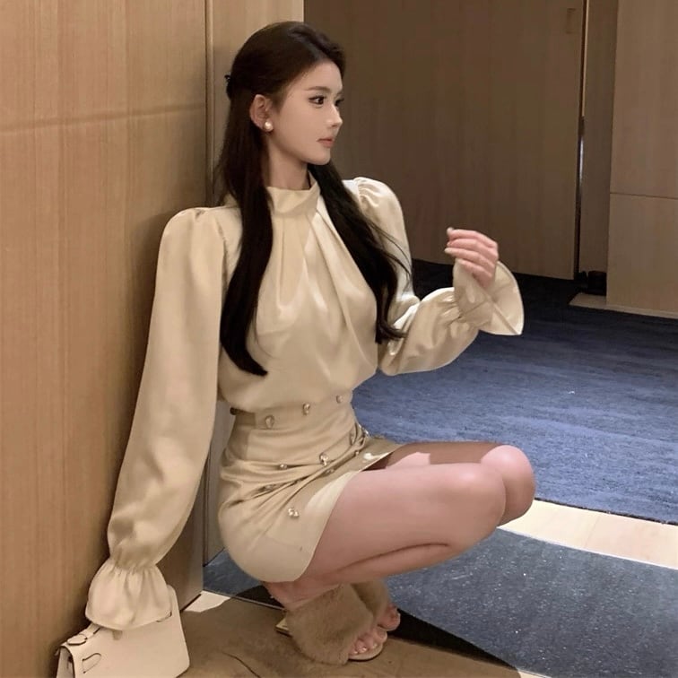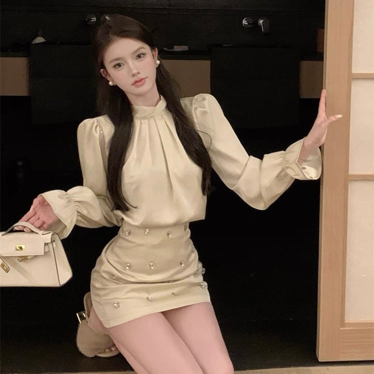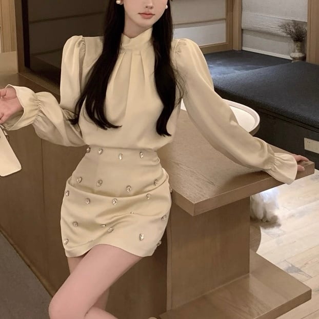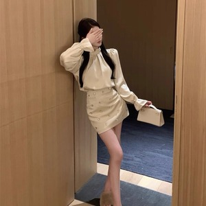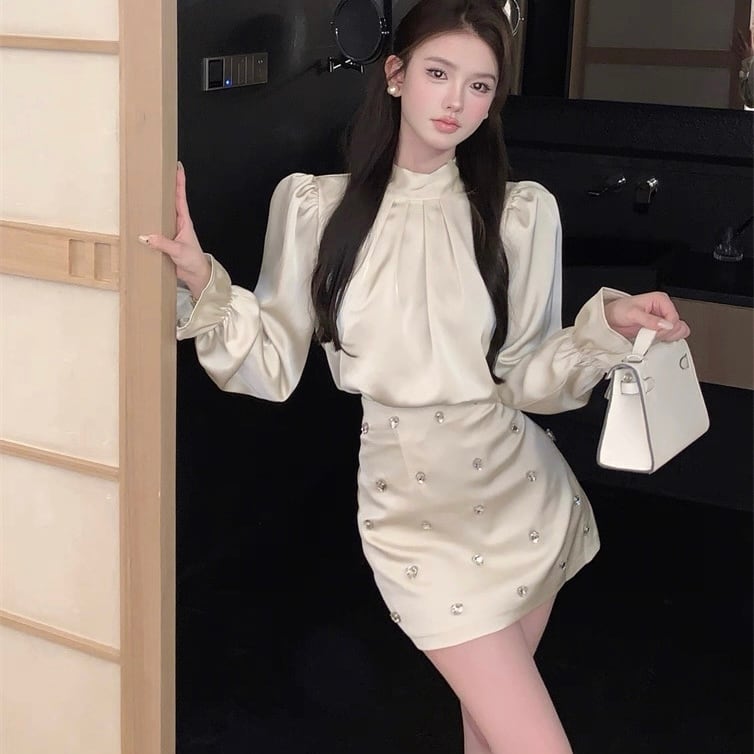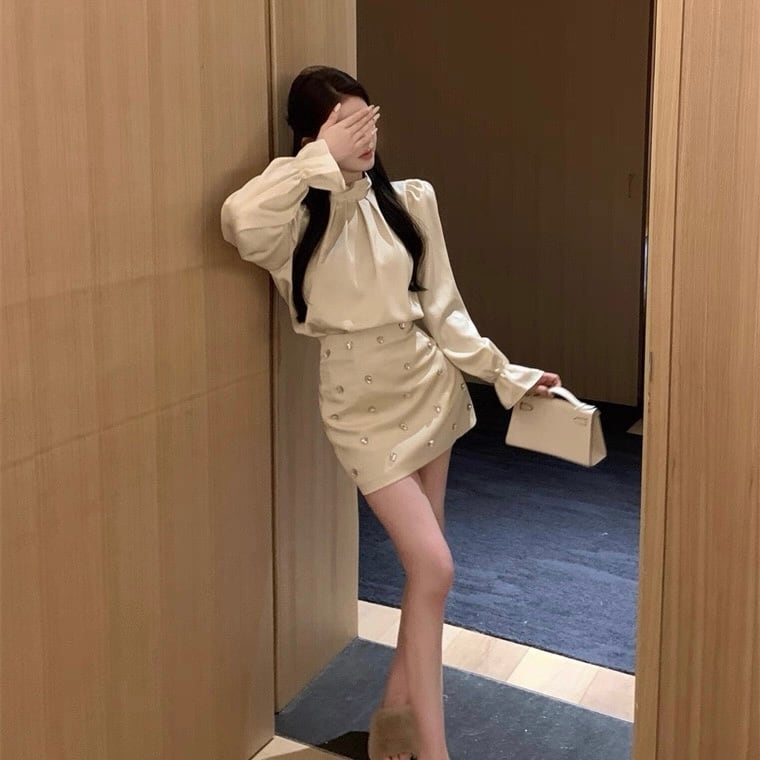 2色♡バックリボンブラウス+ビジューミニスカートセット