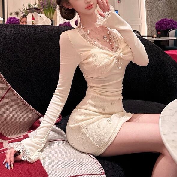 ガーリー♡異素材×レースドッキングタイトミニワンピース